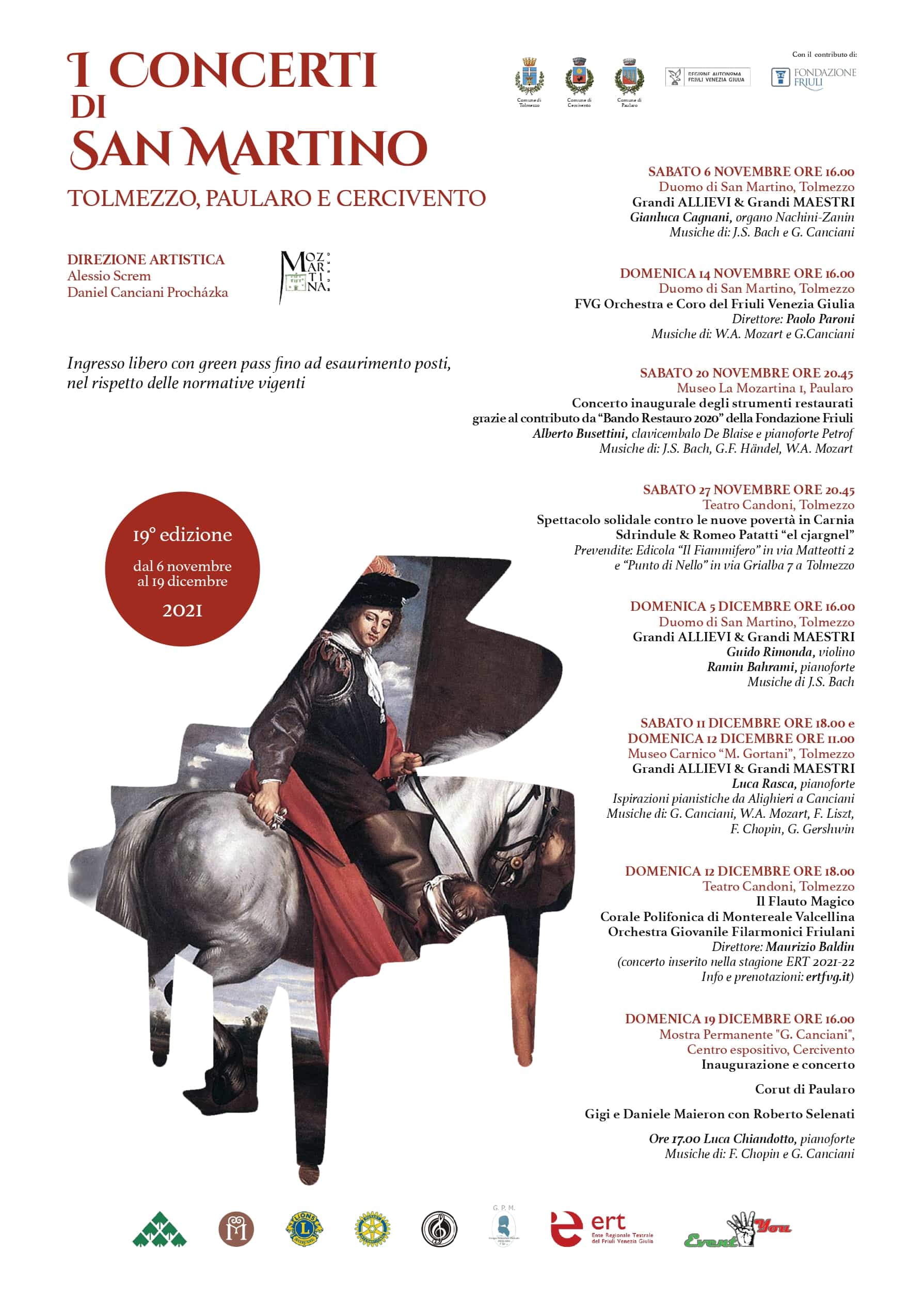 I Concerti di San Martino in Carnia sono una tradizione che si rinnova da diciannove anni ed è l’unica rassegna che propone musica classica nelle terre alte durante la stagione autunnale. Mette in rete i comuni di Tolmezzo, Paularo e Cercivento e quest’anno regala nove appuntamenti grazie al contributo della Regione Friuli Venezia Giulia, da sabato 6 novembre a domenica 19 dicembre, con diverse sorprese, prime assolute e speciali inaugurazioni. È il fervente lavoro condotto dal direttore artistico Alessio Screm in sinergia con Gli Amici della Mozartina presieduti da Daniel Canciani Procházka, interessati sulla spinta motivante di lungimiranti insegnamenti, a condurre con la stessa passione, determinazione e lungimiranza, le vie della cultura aperte dal compositore Giovanni Canciani (1936-2018), padre fondatore della rassegna musicale carnica oltre che di innumerevoli altre iniziative e progetti, tra cui La Mozartina 1 e 2, il ripristino degli interni di Palazzo Calice a Paularo, la riscoperta di Jacopo Linussio, il restauro del clavicembalo storico del Museo Gortani ed il dono di altri cimeli.