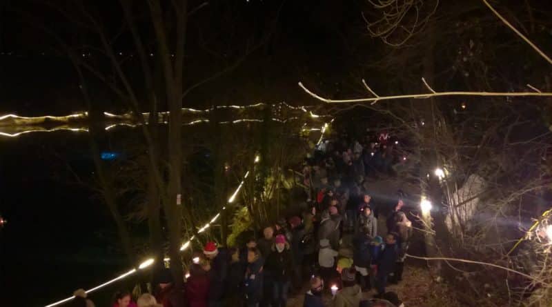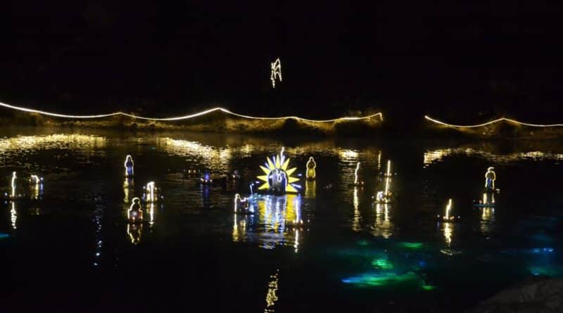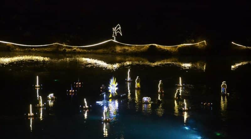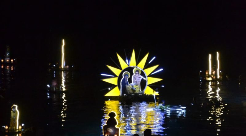 Contemporaneamente sono confluite le altre figure del presepe scortate dalla stella cometa che pian piano scendeva dall’alto, fino a quando le luci di contorno hanno illuminato a giorno il contesto, arricchito dalla presenza di un albero di Natale galleggiante e da alcune fontane luminose.
