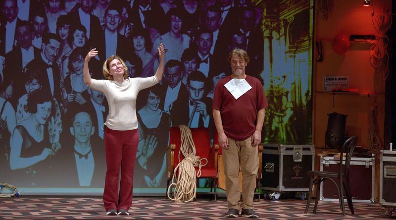 Sabina Guzzanti e Giorgio Tirabassi sul palco del Teatro Italia di Pontebba
