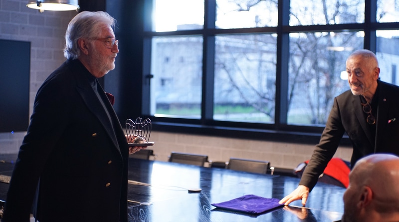 Mario Biasutti, fondatore della Mabi International, costituita nel 1980 a San Daniele del Friuli per lo sviluppo di modelli e per la produzione di pelletteria con marchio “Andrea Mabiani”, ha infatti ricevuto un altro riconoscimento, questa volta dai suoi colleghi friulani: una targa ricordo a nome di tutti gli imprenditori associati a Confindustria Udine consegnatagli dal presidente Gianpietro Benedetti, ospite di Biasutti in occasione di una visita all’azienda di San Daniele promossa congiuntamente dai Gruppi Moda, Tessili e Manutenzioni Operative e Industrie metalmeccaniche di Confindustria Udine, cui hanno partecipato i rispettivi capigruppo, Matteo Di Giusto e Davide Boeri, oltre al direttore generale dell’Associazione, Michele Nencioni. Presente alla visita anche un nutrito gruppo di imprese della filiera metalmeccanica di Confindustria Alto Adriatico, guidate da Gianfranco Bisaro.