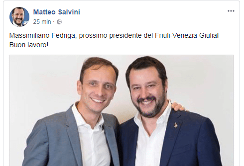 “Massimiliano Fedriga prossimo presidente del Friuli Venezia Giulia! Buon lavoro”. Lo annuncia il leader della Lega Matteo Salvini su Twitter postando una foto insieme con Fedriga, capogruppo della Lega alla Camera nella passata legislatura.