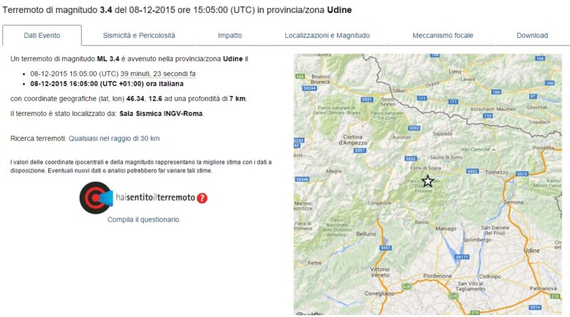 Alle 16.05 la terra ha tremato per un sommovimento tellurico di 3.4 gradi, profondità 7 km, con epicentro a Forni di Sopra.