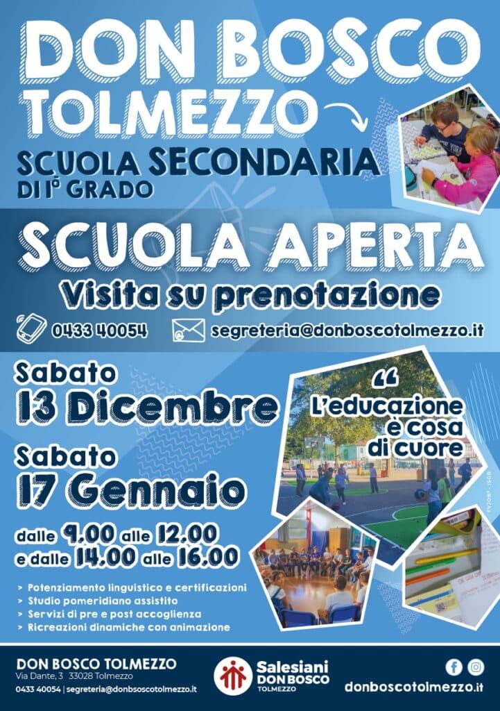 La scuola salesiana di Tolmezzo spalanca le sue porte. Sabato 13 dicembre dalle 9 alle 12 e dalle 14 alle 17 appuntamento con “Scuola aperta” per conoscere il Collegio Don Bosco, i suoi insegnanti e il piano dell’offerta formativa.