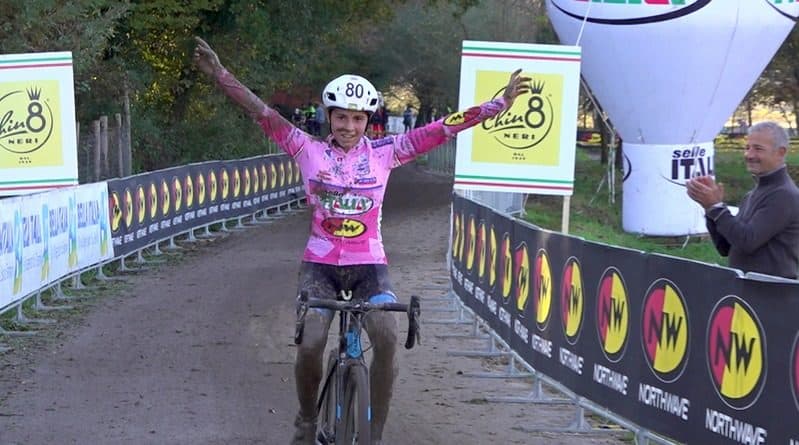 DONNE OPEN – Torna a gioire Sara Casasola (DP 66, nella foto al traguardo) che si dimostra la più pronta ad affrontare il duro fango di Ferentino, pedalando con una grinta e un colpo di pedale che quasi non lasciavano tradire le difficoltà del tracciato. Sempre più solida la sua maglia rosa, mentre brilla ancor più il bianco della leader delle giovani Gaia Realini (Vallerbike), un colore che è riuscito a frsi notare, retorica a parte, anche nel fango. La giovanissima abruzzese (non ha ancora 17 anni) ha staccato la vincitrice uscente del Girio d’Italia Ciclocross Alessia Bulleri (Merida Italia Team) dimostrando che ha tanta grinta da vendere.