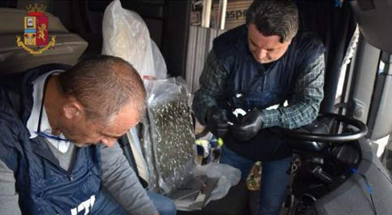 Il personale tecnico specializzato dell’officina si è accorto dell’uso fraudolento di una seconda scheda inserita nel “cronotachigrafo”, non intestata al conducente, e durante queste fasi nella cabina di guida sono state notate alcune buste di plastica trasparente termosaldate, contenenti della sostanza vegetale di colore verde somigliante alla marijuana.