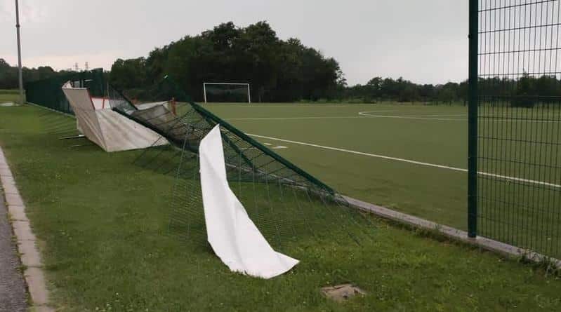 L’ultima ondata di maltempo ha provocato anche grossi danni agli impianti sportivi, come si vede nella foto, spostando le porte di gioco e rompendo parte della rete di recupero di recinzione.