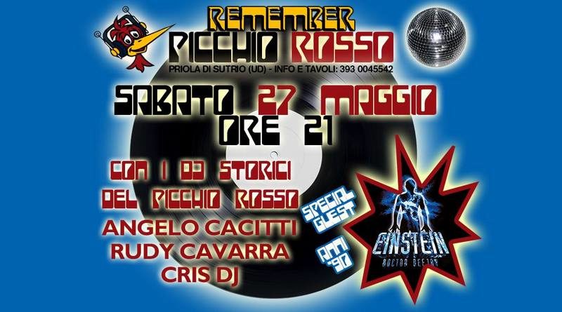 In quest’ultima festa, tra i DJ storici torna al Picchio Rudy Cavarra, che assieme ad Angelo Cacitti e Cris DJ accoglierà il primo special guest dei “Remember”, direttamente dalle classifiche dance degli anni ’90, Einstein Doctor Deejay.