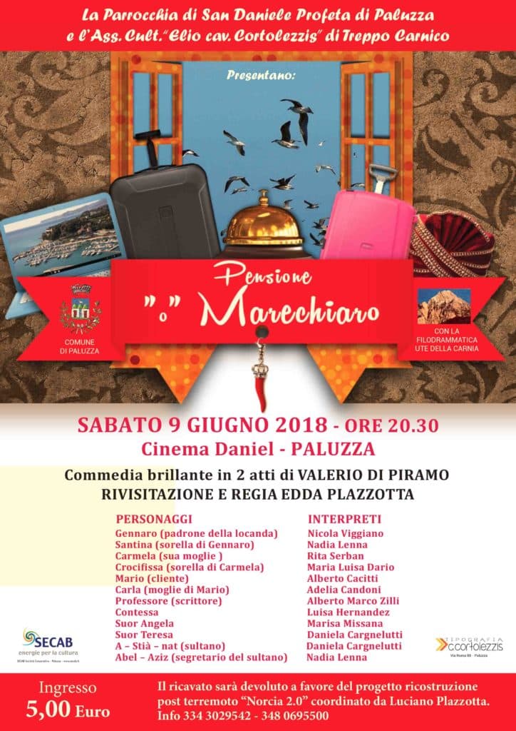 La Parrocchia di San Daniele Profeta di Paluzza e l’Ass. Cult. “Elio cav. Cortolezzis” di Treppo Carnico organizzano una serata a teatro con “Pensione “o” Marechiaro”, commedia brillante in 2 atti di Valerio di Piramo, con la filodrammatica dell’UTE della Carnia e la rivisitazione/regia di Edda Plazzotta.