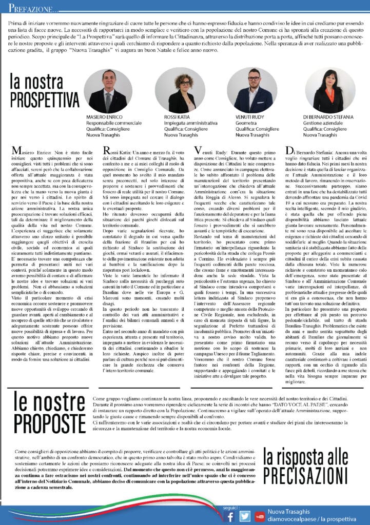 “Scopo principale de “La Prospettiva”, che avrà cadenza semestrale, sarà quello di informare la cittadinanza, attraverso la distribuzione porta a porta, affinché tutti possano conoscere le nostre proposte e gli interventi attraverso i quali cerchiamo di rispondere a quanto richiesto dai cittadini – dice l’esponente dell’opposizione-. Sono presenti i numeri utili che permettono di contattare facilmente chi può essere d’aiuto”.