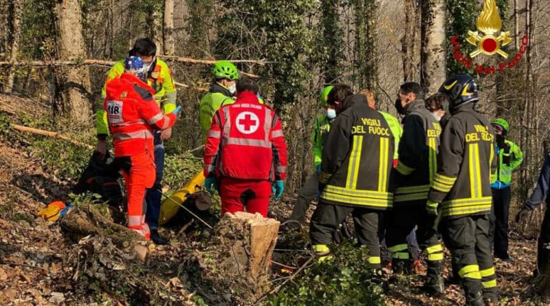L’arto dell’uomo è stato immobilizzato e il ferito caricato in barella e trasportato a spalle in ambulanza.