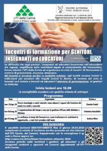 L’UTI della Carnia, nell’ambito delle attività del Corpo di Polizia locale, ha voluto mettere a disposizione di genitori, insegnanti ed educatori alcuni momenti di formazione fruibili da casa, al fine di prevenire e gestire nel modo migliore eventuali comportamenti devianti e situazioni di disagio.