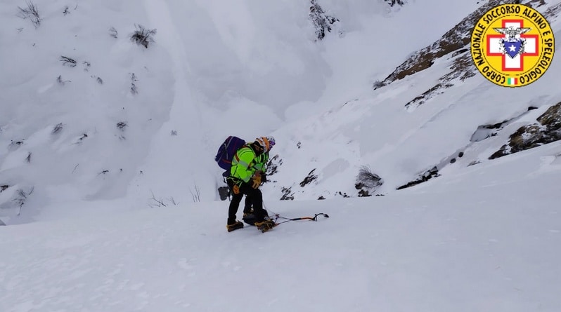 Si è deciso quindi di intervenire percorrendo con piccozza e ramponi il canale in cui il ragazzo era caduto, attrezzando una sosta di sicurezza.