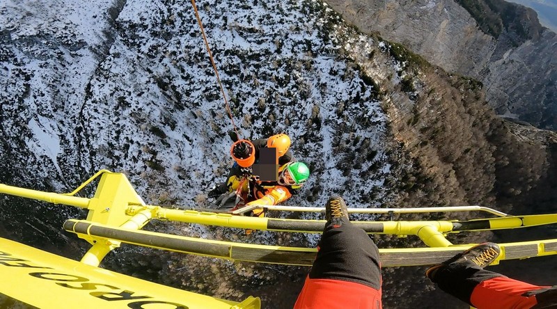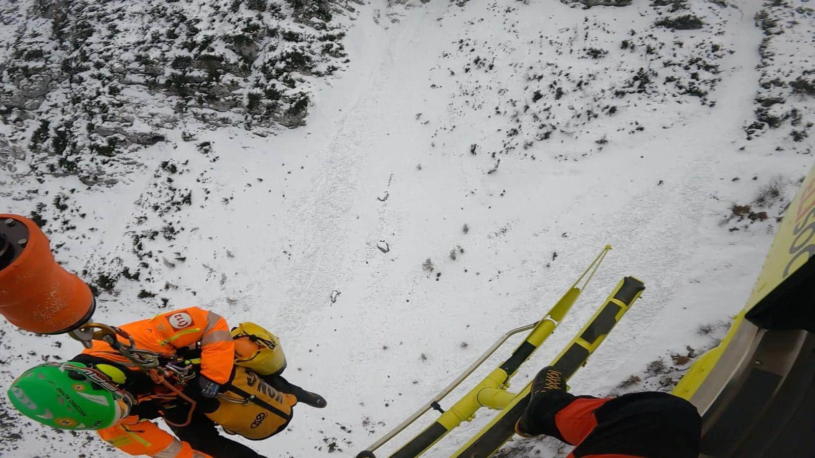 L’equipe dell’elisoccorso lo ha avvistato in sorvolo già in piedi e in movimento (cercava di portarsi spontaneamente in un punto più visibile e comodo per il recupero, ha riferito) e ha optato per una calata del tecnico di elisoccorso tramite verricellata di circa quaranta metri nei pressi della cima.