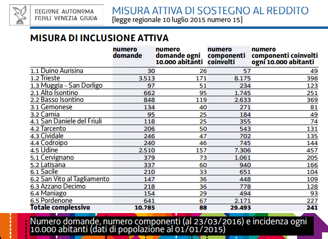 Con queste parole la presidente della Regione Friuli Venezia Giulia Debora Serracchiani ha introdotto la presentazione dei dati relativi alla Misura di inclusione attiva e di sostegno al reddito avviata dall’Amministrazione regionale nell’ottobre del 2015 (legge regionale n. 15 del 10 luglio 2015) e che ha registrato 10.785 domande di nuclei familiari per una platea complessiva che coinvolge 29.493 persone.
