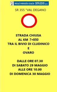 Un’ordinanza di FVG Strade stabilisce l’interdizione al traffico veicolare e pedonale dalle ore 7.30 di sabato 29 maggio alle ore 10 di domenica 30 nel tratto di rettilineo fra il bivio di Cludinico e Ovaro della Strada Regionale 355 della Val Degano.