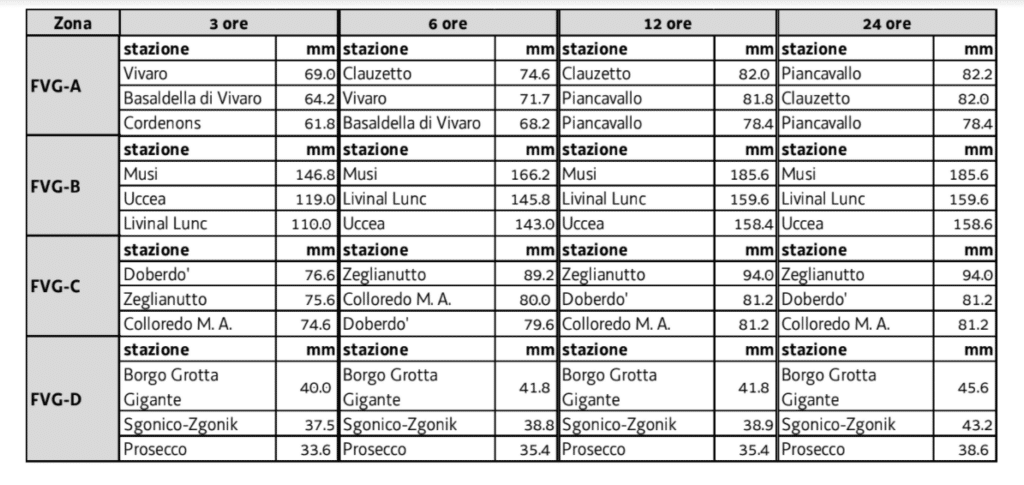 In tabella le precipitazioni delle ultime 6, 12 e 24 ore: