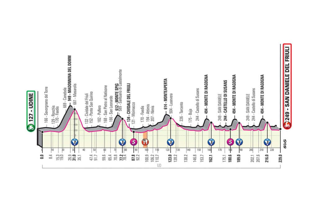 Martedì 20 ottobre la 16a tappa vedrà la partenza da Udine, dove gli atleti dovranno percorrere 229 km con una prima parte su e giù per le Prealpi Giulie e il finale in circuito con l’arrivo al centro storico di San Daniele del Friuli, che verrà percorso per 3 volte sino al traguardo di gara in Via Umberto I. Il podio, dove verranno premiati i vincitori della tappa, verrà situato in Piazza Vittorio Emanuele II. Lungo il rettilineo dell’arrivo saranno distribuite le tribune e le varie aree ospitalità. L’open Village, il villaggio commerciale dedicato agli espositori ufficiali e alla Carovana Rosa sarà allestito in Piazza IV Novembre. Il Quartiere di Tappa, sede della stampa giuria e organizzazione, sarà allestito presso lo storico palazzo Monte di Pietà in centro. Nel cuore del centro storico si troveranno quindi i punti nevralgici della corsa dell’organizzazione. L’arrivo di tappa a San Daniele è reso possibile dalla collaborazione tra il Consorzio del prosciutto di San Daniele e l’amministrazione comunale, con il supporto del Consorzio We Like Bike e della locale Pro Loco.