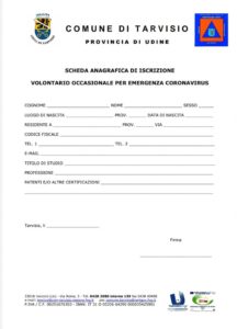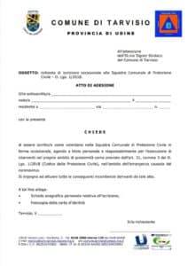 Per esigenze assicurative, è necessario iscriversi come volontario nella squadra comunale di P.C., in forma occasionale, compilando la modulistica, scaricabile qui sotto e sul sito del Comune di Tarvisio oppure trovare presso l’ufficio relazioni per il pubblico, all’ingresso del Municipio.