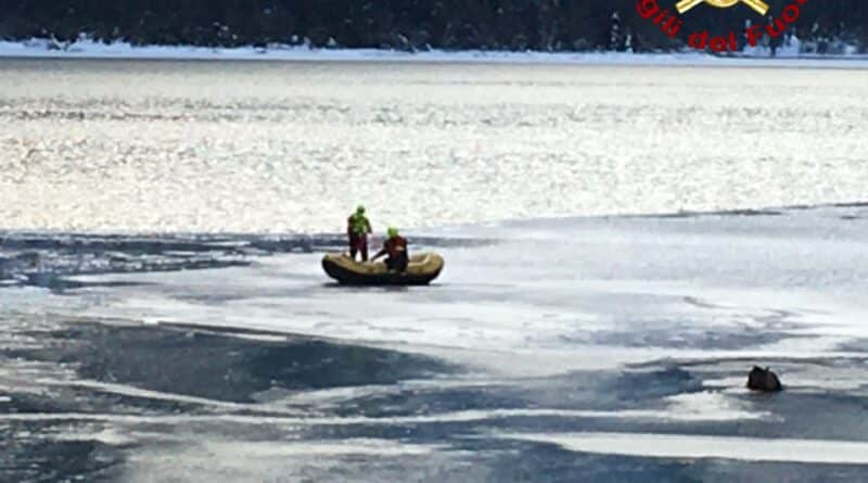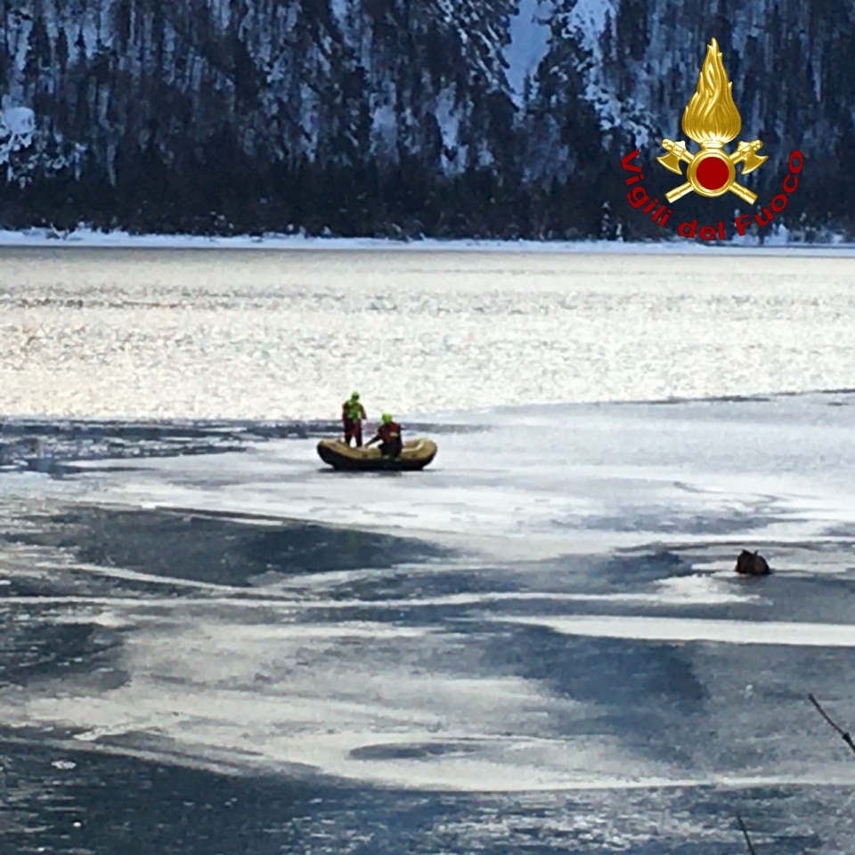 I Vigili del fuoco dopo aver indossato delle mute stagne e utilizzando un gommone da rafting, al quale si erano assicurati nell’eventualità il ghiaccio cedesse sotto i loro passi, hanno raggiunto l’animale ferito e lo hanno riportato sulla riva del lago.