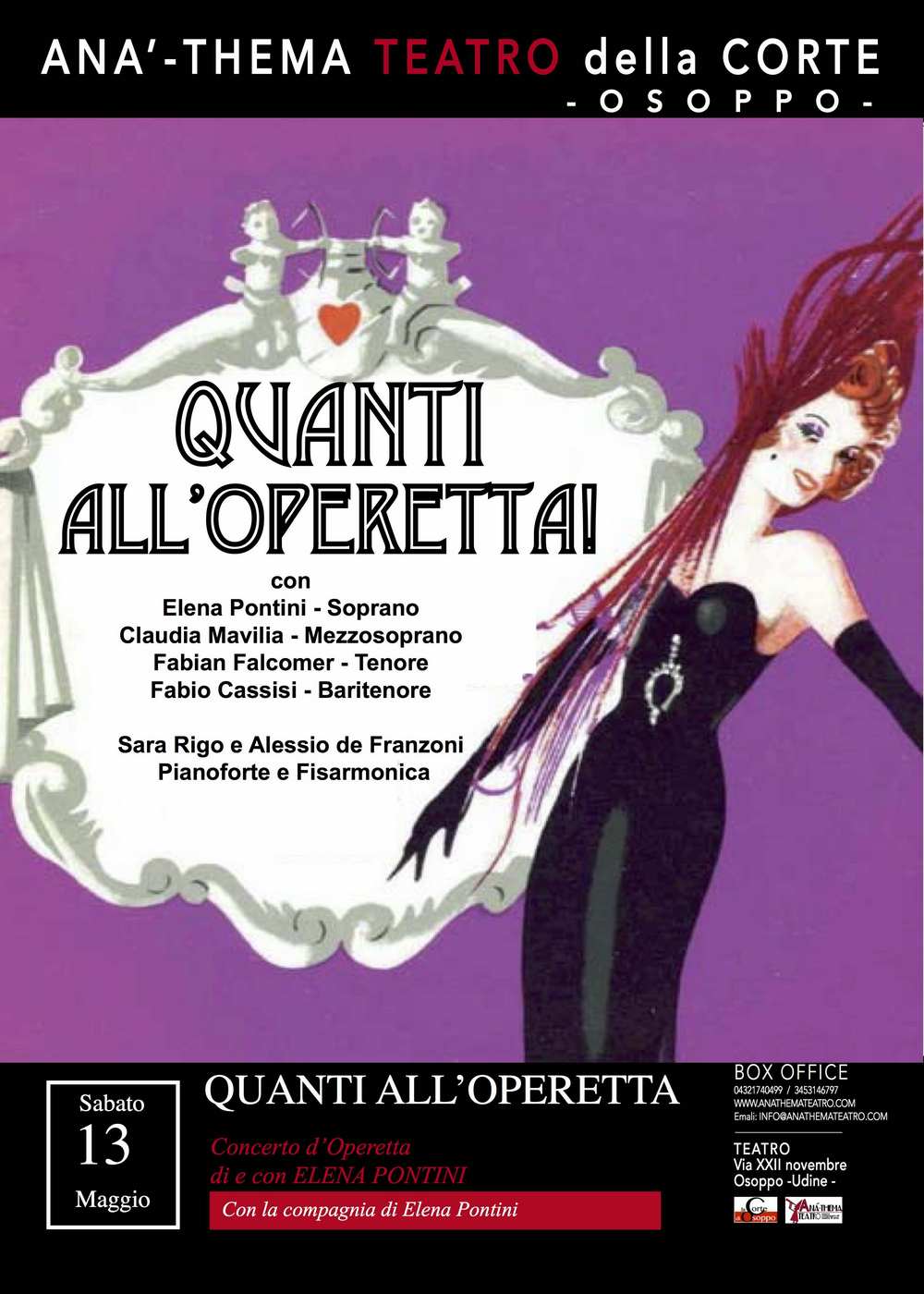 Andrà in scena l’Operetta rivisitata dall’energica e talentuosa Elena Pontini, da tempo membro della compagnia Anà-Thema come soprano in diverse produzioni. Qui debutta con uno spettacolo in anteprima regionale, “Quanti all’Operetta“, riunendo importanti artisti per una serata che si prospetta entusiasmante.