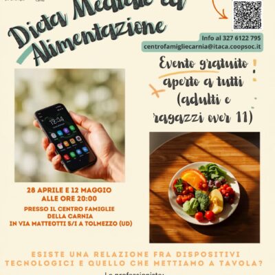 Esiste una relazione tra l’uso dei dispositivi tecnologici e quello che mettiamo a tavola? Per rispondere a questa domanda, il Centro Famiglie della Carnia organizza un doppio incontro dal titolo “Dieta Mediale ed Alimentazione”. Gli appuntamenti si terranno martedì 28 aprile e martedì 12 maggio, sempre alle ore 20:00, presso la sede di via Matteotti 5/I a Tolmezzo.