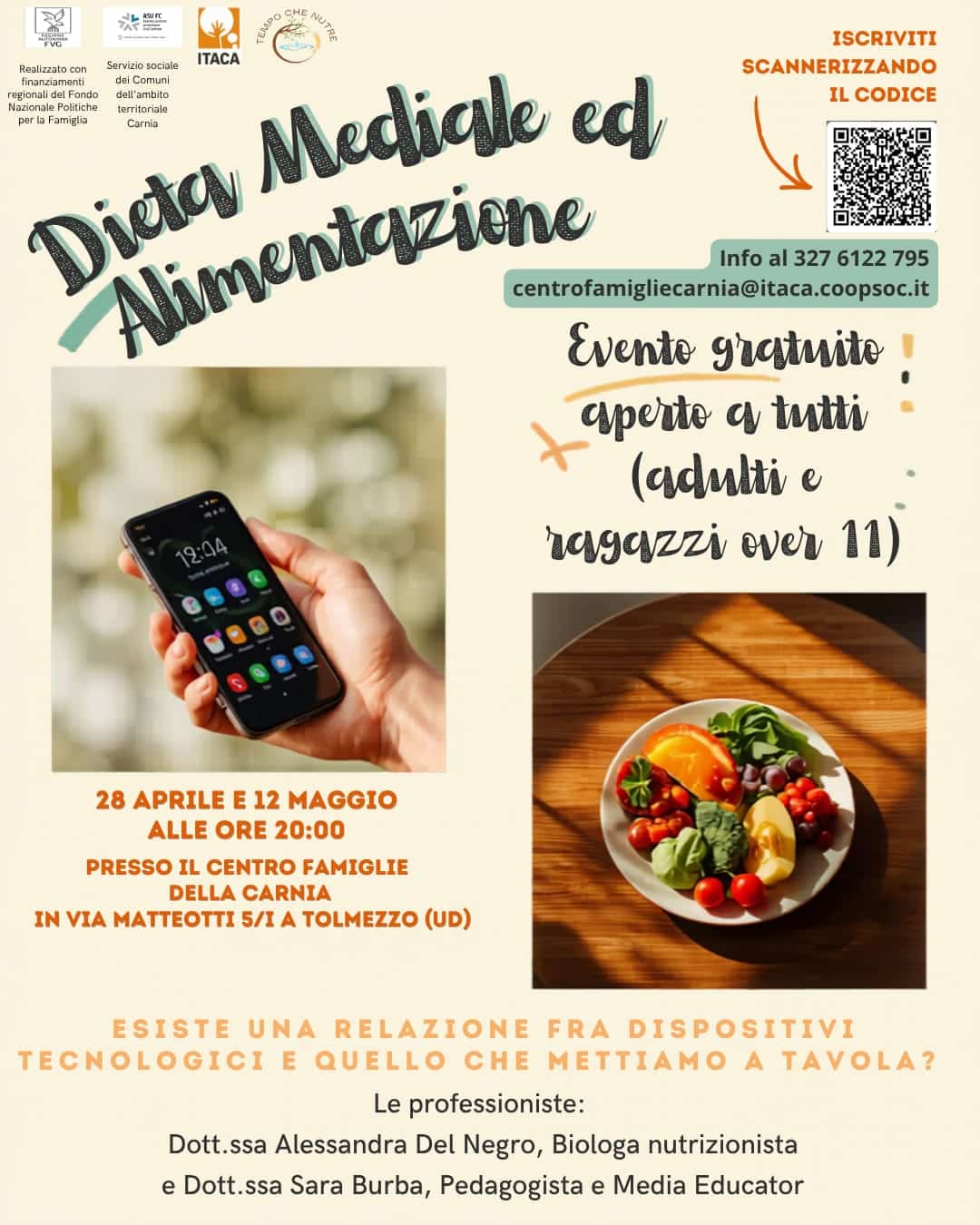 L’iniziativa, gratuita e aperta a tutti (adulti e ragazzi sopra gli 11 anni), si pone l’obiettivo di approfondire il legame tra abitudini digitali e stili alimentari. A guidare il confronto saranno due professioniste: la dottoressa Alessandra Del Negro, biologa nutrizionista, e la dottoressa Sara Burba, pedagogista e media educator. Il progetto è realizzato con i finanziamenti regionali del Fondo Nazionale Politiche per la Famiglia, in collaborazione con il Servizio sociale dei Comuni dell’Ambito territoriale Carnia e la cooperativa Itaca.