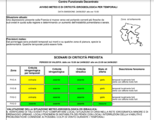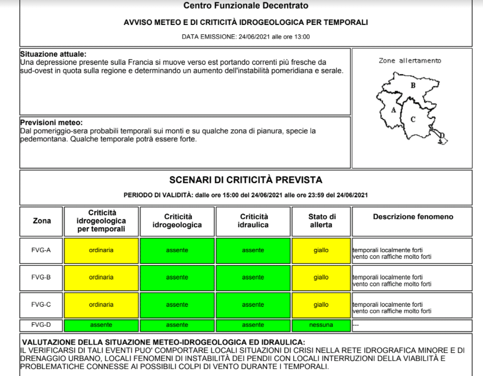 La Protezione Civile FVG ha diramato un’Allerta Regionale valida dalle 15 alle 23.59 di oggi, giovedì 24 giugno, per temporali localmente forti e vento con raffiche molto forti.