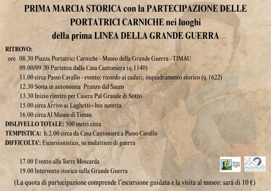 Sabato 21 giugno con partenza alle 8.30 dal Museo di Timau ci sarà la possibilità di visitare le prime linee della Grande Guerra. L’escursione storica, aperta a tutti con un costo di 10 euro a persona, si svolgerà con l’ascesa in quota accompagnati dai revocatori in divisa da soldati della grande guerra e dalle rievocatrici delle Portatrici carniche.