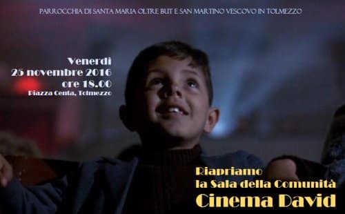 “Nel cuore di una comunità ci sono gli spazi e i tempi in cui essa condivide racconti e bellezza. Tolmezzo, grazie all’aiuto di enti e persone che ci credono, riapre per questo il suo Cinema. La invitiamo a prendere parte all’inaugurazione, venerdì 25 novembre 2016 alle ore 18.00: dopo la benedizione e i saluti, una proiezione ci incanterà, concludendo con un brindisi. Con il sostegno del Comune di Tolmezzo, dell’ACEC, della Fondazione CRUP, della CCIAA di Udine, della Banca di Carnia e Gemonese”.