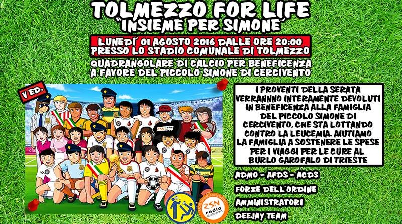 Lunedì 1 agosto allo Stadio Comunale di Tolmezzo, con inizio alle ore 20, ritorna la 5° edizione di “Tolmezzo for Life“, il torneo di calcio a scopo benefico nel quale si si sfideranno in un quadrangolare Deejay team, Rappresentativa ADMO-AFDS-ACDS, Rappresentativa delle Forze di Polizia e Rappresentativa Amministratori della Carnia.