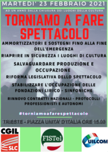 Sono gli obiettivi della campagna #torniamoafarespettacolo, indetta dai sindacati di categoria Slc-Cgil, Fistel-Cisl e Uilcom per martedì 23 febbraio, a un anno di distanza dalla prima chiusura dei luoghi di cultura.