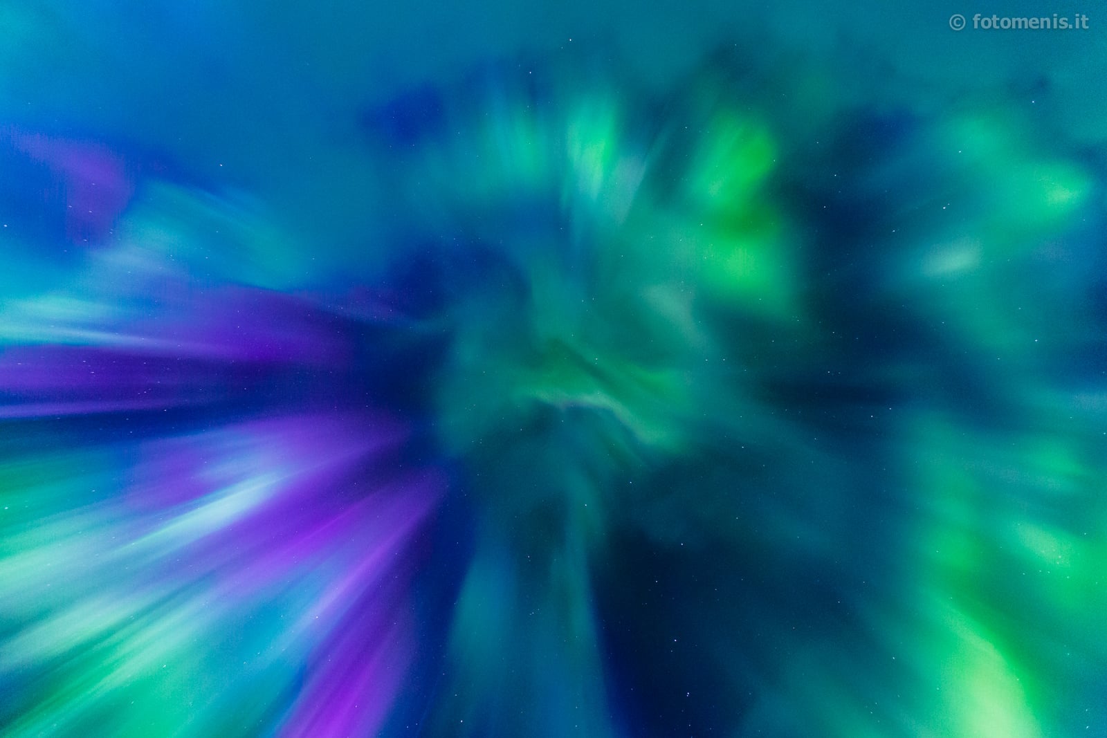 “aurore blu”, che si verificano a più alta quota altimetrica rispetto a quelle verdi e viola, colori più comuni. “In queste ultime nottate – spiega il fotografo – la situazione era veramente incredibile: abbiamo avuto ore e ore di serpenti danzanti in cielo che hanno illuminato il paesaggio circostante in un onirico gioco di luci e forme. L’attività geomagnetica era talmente elevata da rendere visibile anche la colorazione bluastra dell’aurora boreale, causata dall’eccitazione delle particelle di azoto alle quote più alte della nostra atmosfera”.