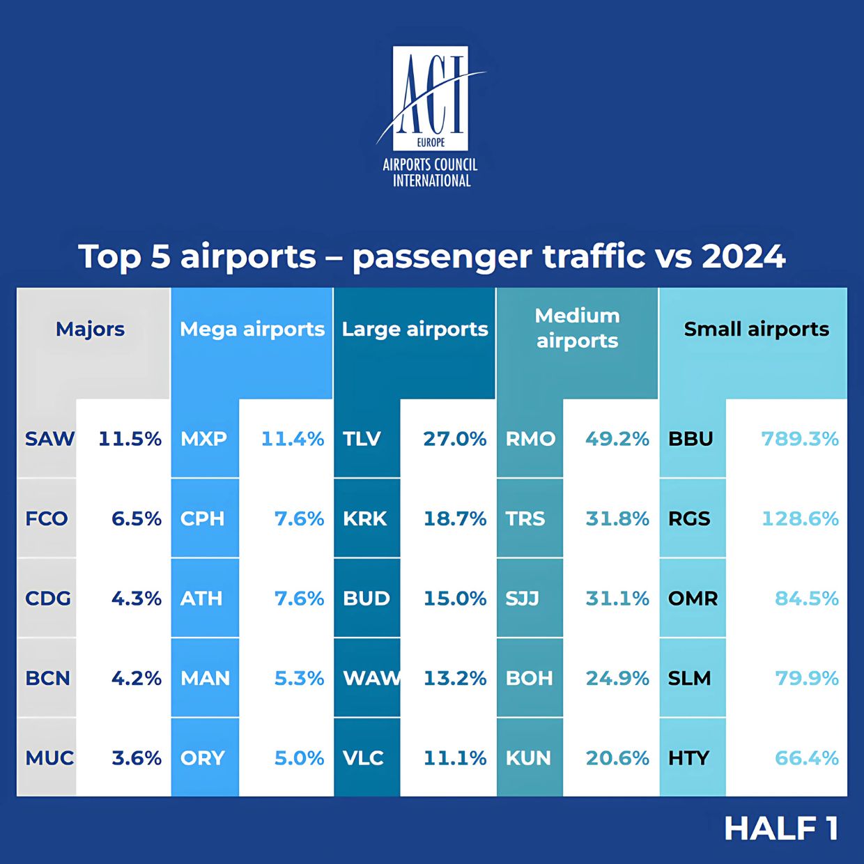 Airport Council International (ACI) Europe ha pubblicato i top 5 airports per crescita di traffico – tra i 450 aeroporti in Europa membri ACI – del primo semestre 2025 rispetto lo stesso periodo dello scorso anno*.