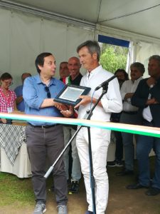 In foto – Renzo Livoni (presidente AAFVG) mentre riceve il primo premio) e Vanni Micolini (responsabile malga Montasio) con una forma di Montasio dop prodotto sull’altopiano