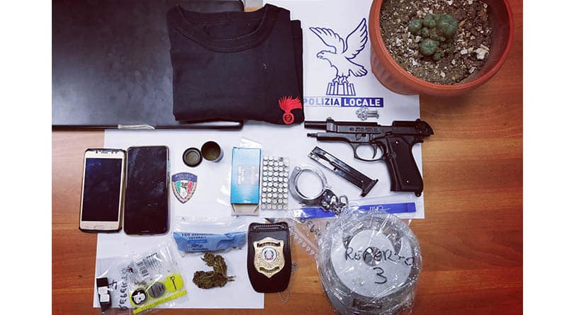 Qui, oltre al recupero di ulteriore sostanza, gli inquirenti hanno ritrovato: un indumento facente parte della divisa operativa dei Carabinieri, di colore nero con segno distintivo ricamato in rosso; manette munite di chiavi, del tutto simili a quelle in uso alle Forze di Polizia; una pistola nascosta all’interno di una intercapedine facente parte della struttura portante dell’abitazione.