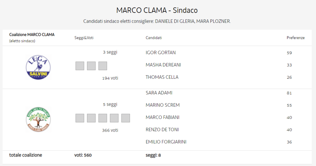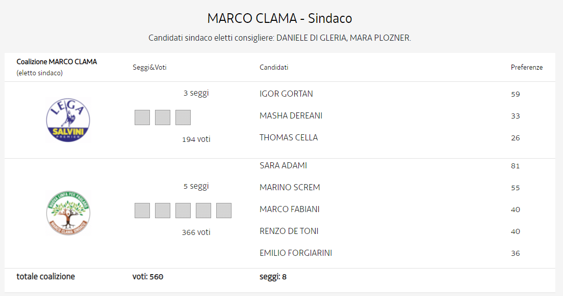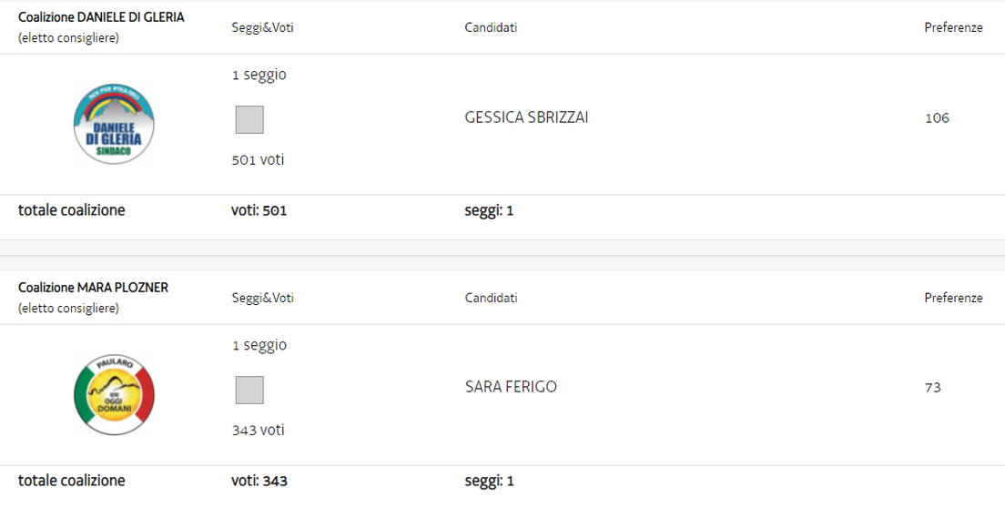 Ecco il nuovo consiglio comunale, con 8 consiglieri di maggioranza mentre Di Gleria e Plozner saranno affiancati dal più votato delle rispettive liste a a sostegno (in entrambi i casi si tratta di una donna) della loro lista.