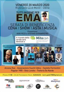 Ecco allora “Tutti insieme per EMA“, una serata di beneficienza che non è solo cena (con 6 chef), non è solo show, asta benefica e musica, ma un momento in cui aprire il cuore, ed unirsi nel grande aiuto che può essere dato a Emanuele e a tutti quei pazienti che vedono scorrere la propria vita, fermi in un letto d’ospedale, affetti da malattie simili alla sua.