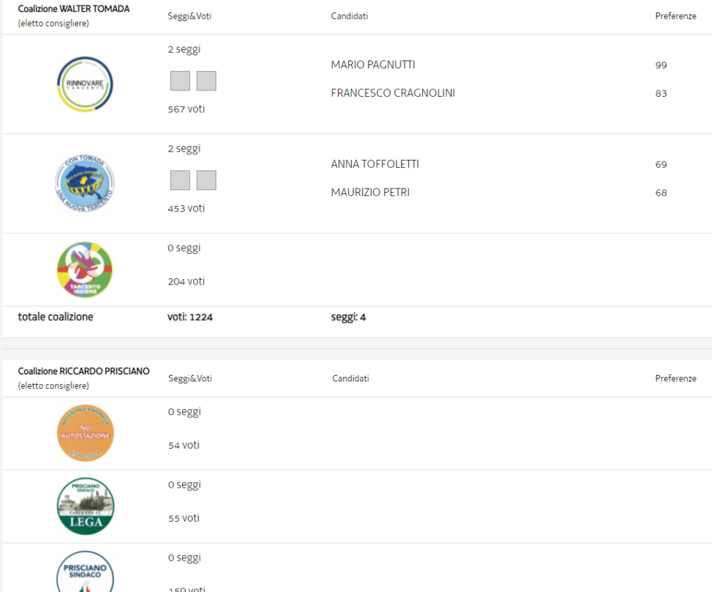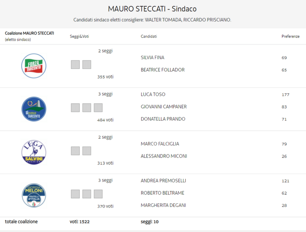 Il primo cittadino uscente ha ottenuto il 47,36% (2013 voti) contro il 43,86% (1864 voti) di Walter Tomada e l’8,78% (373 voti) di Riccardo Prisciano. Sono quindi 149, su 4250, i voti che separano Steccati da Tomada