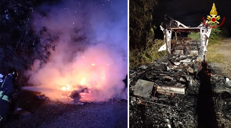 All’arrivo sul posto, con il mezzo completamente avvolto dalle fiamme, i VV.F. hanno iniziato le operazioni di spegnimento abbattendo le fiamme stesse prima che si propagassero alla vegetazione circostante. Spento l’incendio, i Vigili del fuoco hanno provveduto alla bonifica delle parti bruciate, alla messa in sicurezza dell’area e si sono accertati che all’interno del camper, andato completamente distrutto, non vi fossero persone o animali. Sul posto, per quanto di competenza, i Carabinieri.