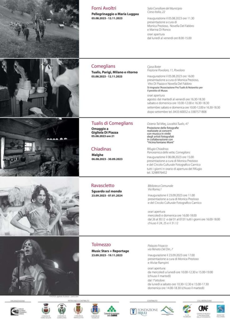 L’impegno del Circolo Culturale Fotografico Carnico, presieduto da Dino Zanier, ha curato con diverse mostre tematiche sparse per la Carnia che si terranno dal 5 di agosto fino a culminare con la mostra del 23 settembre a Palazzo Frisacco di Tolmezzo.