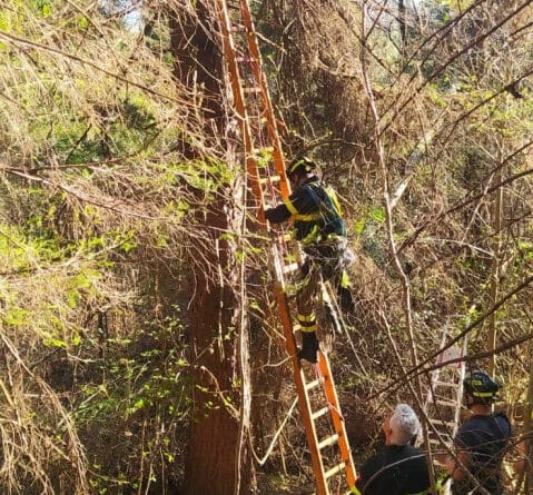 I soccorritori del micio hanno prima posizionato la scala italiana alla base dell’albero e sono saliti per i primi 10 metri.
