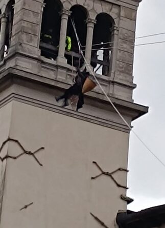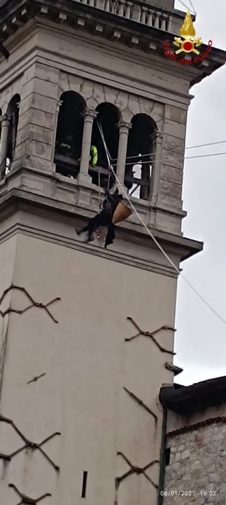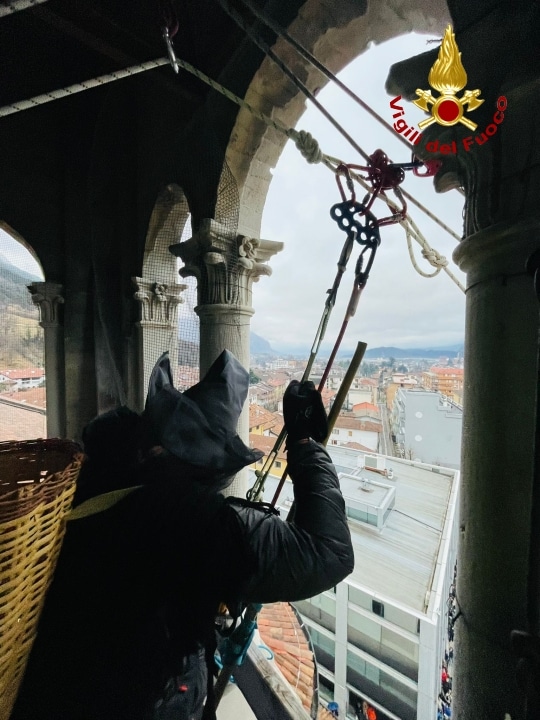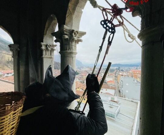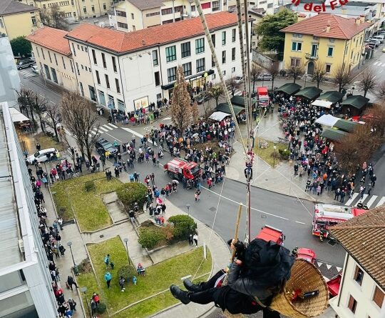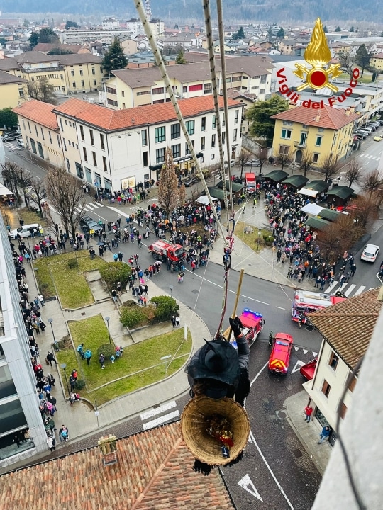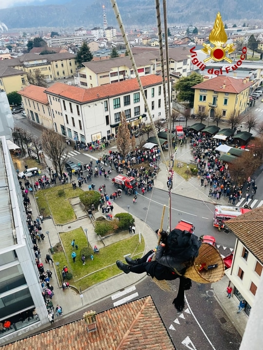 Grande folla ieri, lunedì 6 gennaio, quando alle 16:00 la Befana si è calata dal campanile di Tolmezzo. Anche quest’anno la “nonnina” che porta i doni ai più piccoli, è “volata” dal punto più alto del Duomo cittadino alla piazza grazie ai Vigili del fuoco del Distaccamento del capoluogo carnico che con il personale specializzato SAF (Speleo Alpino Fluviale) ha allestito un sistema di teleferica di circa 90 metri dal campanile cittadino fino a piazza Centa dove la attendevano circa 700 persone.