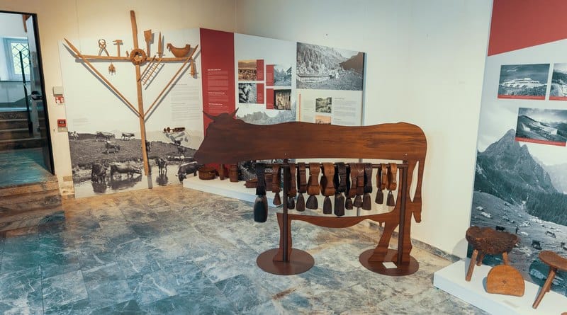 Infine nell’ultima sala “Vita e lavoro In Mont”, viene proposto un approfondimento sulla malga e sul sistema dell’alpeggio. Il pascolo alpino in Carnia è chiamato la mont. L’espressione “andare in mont” significa andare in malga. Per gli alpigiani dunque la “montagna”, il “monte” corrisponde a “pascolo”, “alpeggio”. Storicamente la monticazione del bestiame in mont è una soluzione strategica e quella che oggi si definirebbe una produzione sostenibile. Fino alla metà del Novecento la mont non è solo un sistema economico: è qualcosa che coinvolge l’intero sistema culturale carnico, la scala dei valori, il senso di appartenenza ai luoghi, una comunità di saperi, un patrimonio di leggende e di tradizioni. Al centro di tutto le malghe, le donne, gli uomini e i bambini e anche gli animali. Grande devozione e cura era rivolta loro; venivano benedetti in paese al momento della monticazione per proteggerli, santini e simboli religiosi abbondavano nelle stalle. Chiude il percorso una riflessione sulla trasformazione che sta interessando le malghe nei nostri giorni legata in particolar modo al fenomeno del turismo.
