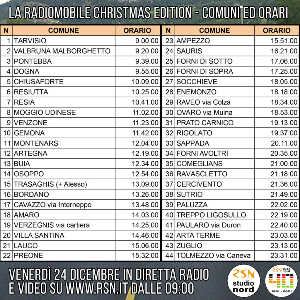 In occasione della vigilia di Natale, venerdì 24 dicembre La Radiomobile percorrerà tutta la zona che quotidianamente raccontiamo anche su questo sito, da Tarvisio a Gemona fino a Sappada, oltre ovviamente a tutta la Carnia.